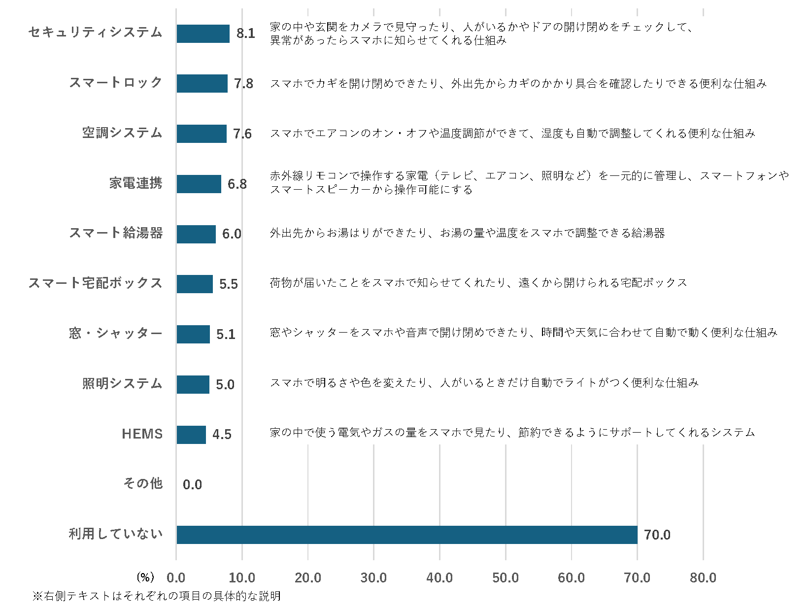 スマホや声で操作できるIoT機器を利用しているかを尋ねたところ、70%の若者が特に利用していないと回答しています(図2)。